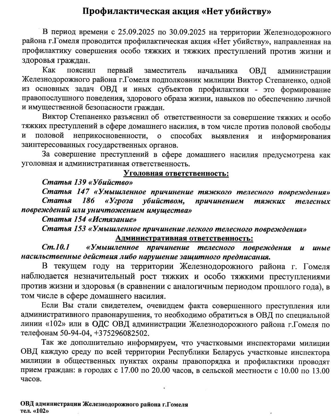 В период времени с 15.12.2025 по 04.01.2026 на территории Железнодорожного района г.Гомеля проводится комплекс профилактических